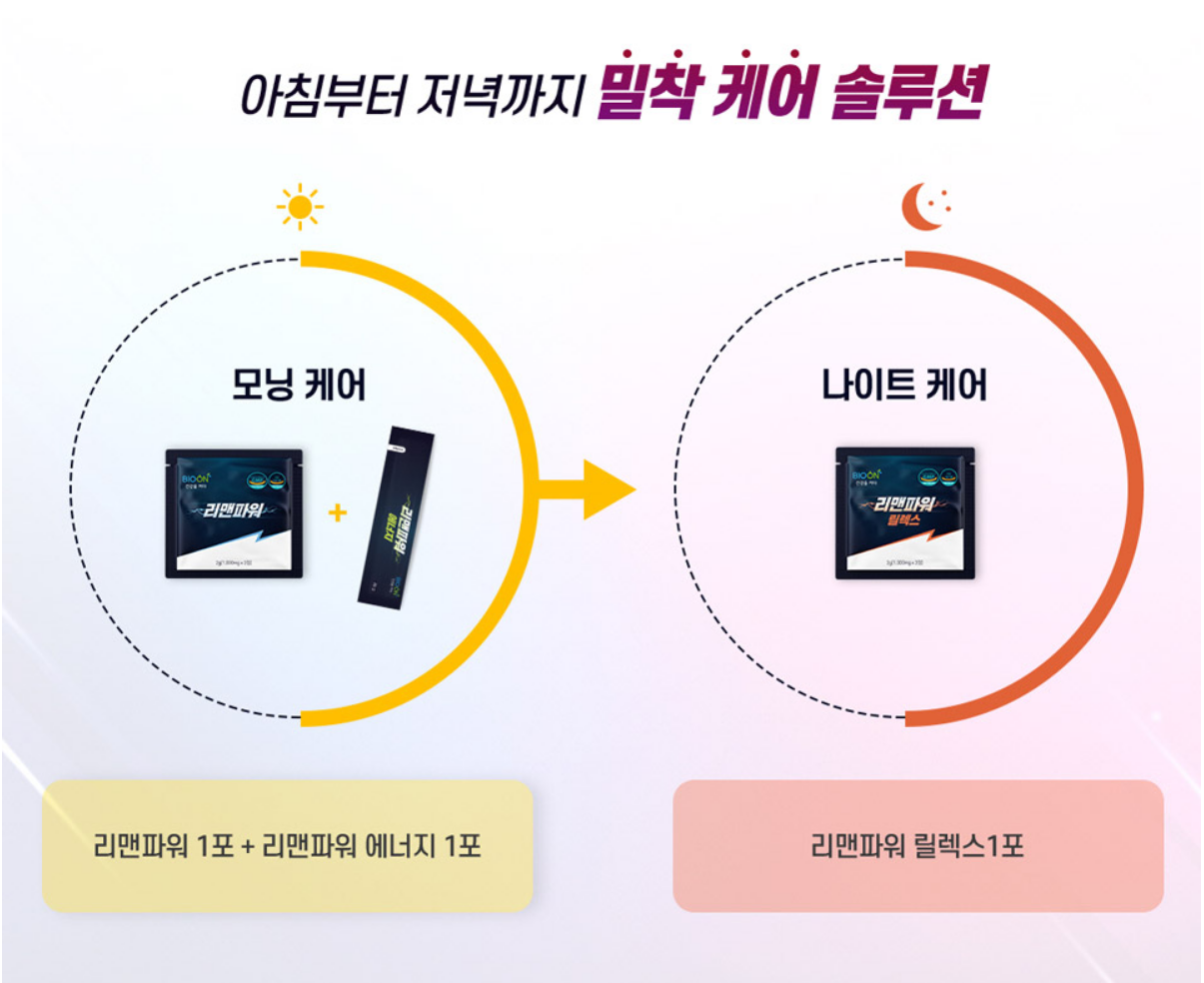 3) 아침/저녁 하루 두 번 남성갱년기 밀착 솔루션 -아침: 리맨파워+리맨파워 에너지 -저녁: 리맨파워 릴렉스